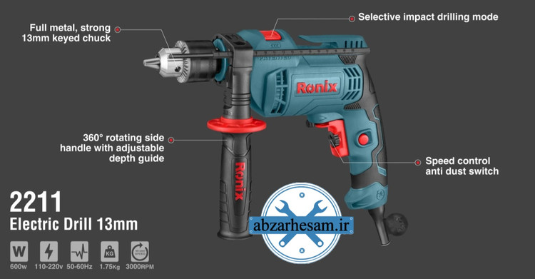 دریل چکشی رونیکس 13 میلی متری 600 وات مدل 2211