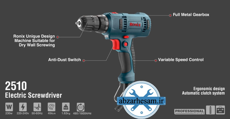 پیچ گوشتی برقی رونیکس دو سرعته ترکمتردار 10 میلی متری 230 وات 2510
