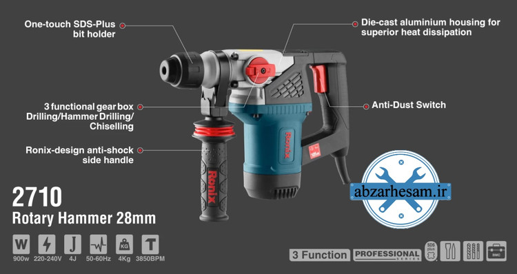 مجهز به کلید خاموش روشن؛ سوئیچ تغییر حالت سوراخکاری، سوراخکاری چکشی و دریل؛ دارای ضامن کلید تغییر حالت؛ کاربرد کلیدهای ضد غبار رونیکس موجب کاهش نفوذ گرد و غبار به دستگاه و افزایش طول عمر آن میشوند.