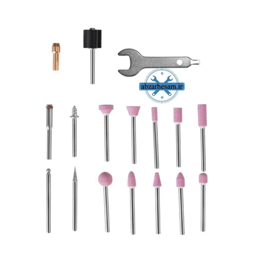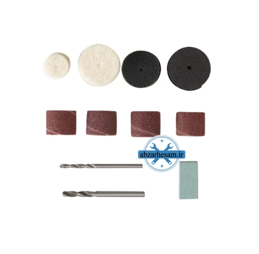 یک عدد شفت سنبادهی 3.2 میلیمتر، دو عدد سنبهی 3.2 میلیمتر، دو عدد متهی 3.2/2.3 میلیمتر، دو قطعه الماس 3.2 میلیمتر، یک عدد سنگ سنباده، آچار، دو عدد کولت 3.2/2.3 میلیمتری، چهار عدد سنبادهی انگشتی، هشت عدد سنگ برشی، سه عدد کاغذ سنباده، چهار عدد نمد، ده عدد سنگ سنباده با شفت 3.2 میلیمتری