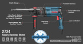 موتور قدرتمند 700 وات با قابلیت تنظیم برای انجام 4 عملکرد مجزای سواخکاری، سوراخکاری چکشی، خلاصکن و تخریب؛ ولتاژ 240-220 ولت؛ فرکانس 60-50 هرتز؛ سرعت در حالت آزاد در محدودهی 1700-0 دور در دقیقه